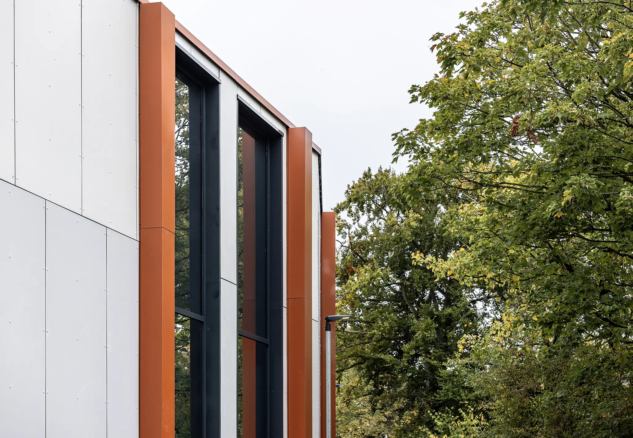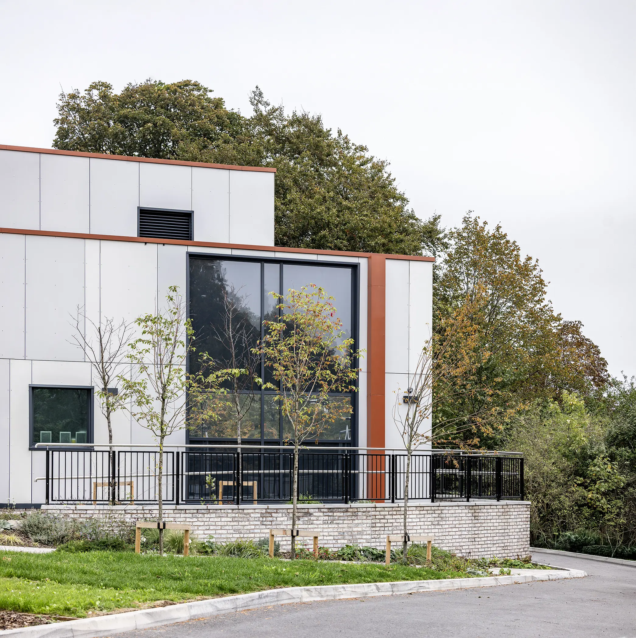 Modern Methods of Construction (MMC) were evaluated, but site access and geometry limited large-volume modular options. Instead, a Metsec lightweight steel framing solution with standardised cladding (Equitone) delivered programme efficiency, repeatability and reduced waste.