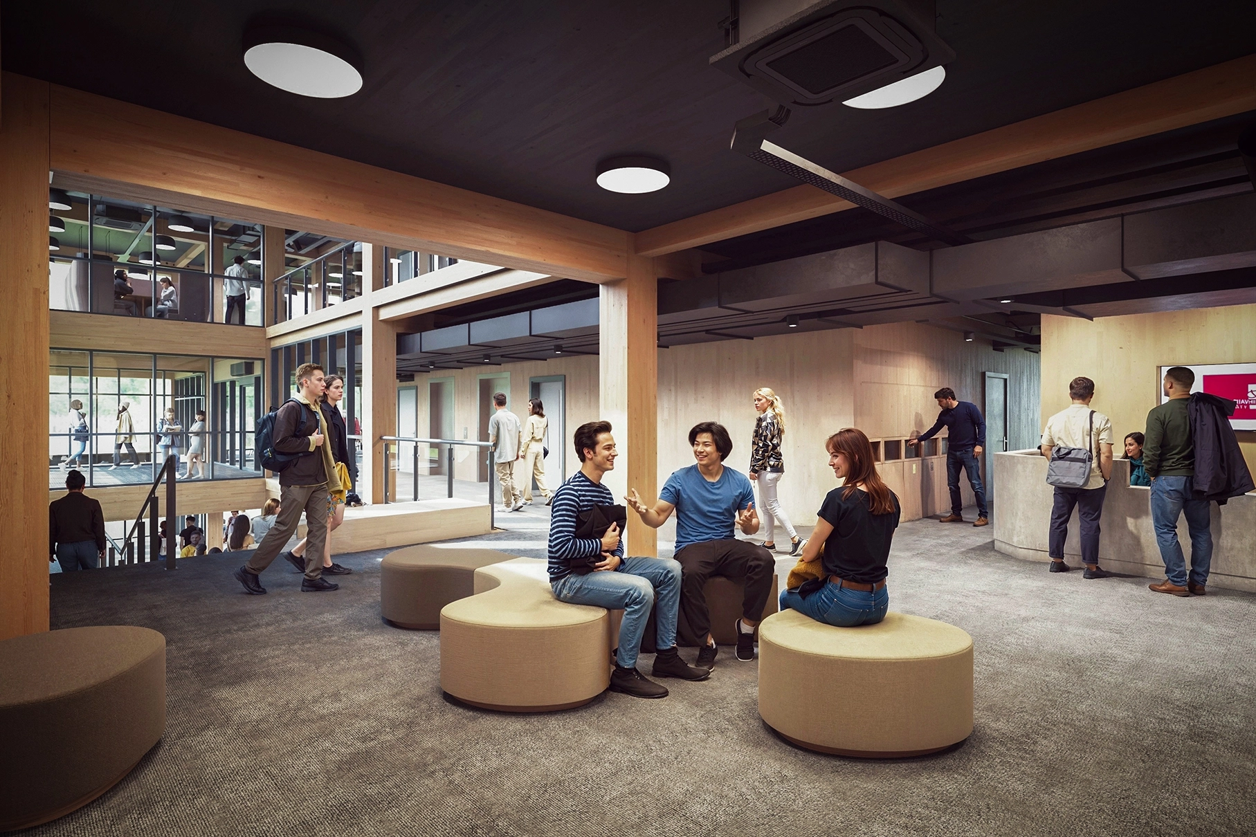 The Hub and associated square are the first arrival point when entering the Village from the campus. The building has been positioned with a clear visual link to the Catalyst building and physical connection is provided via the new bridge and boardwalk across the River Trent and valley wetlands.